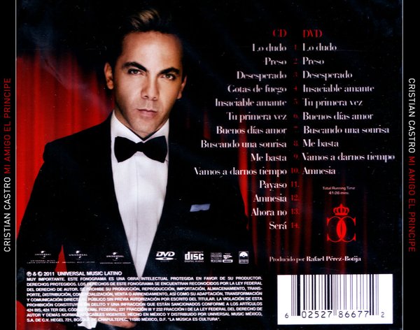 拉丁情歌天王,墨西哥国民天王Cristian Castro最近发行了自己的最新专辑Mi Amigo El Príncipe,这是接应他去年发行的大卖专辑Viva el Principe的姊妹专辑;专辑还是主打Cristian一直以来的成人抒情vocal演唱,专辑由交响乐队全程伴奏,非常高雅,所有歌都是非常大气和哀愁的慢板抒情歌,十足富有拉丁慢板歌的典型特色:哀愁痛苦,大气优美。而天王的演唱还用说么,一如既往的学院派的标志,Cristian Castro一直都是拉丁音乐界的骄傲,这张专辑可谓让Cristian的歌迷深深澄沁在他陶醉又悲苦的情感中,喜欢这个经典天王的歌迷不可错过,