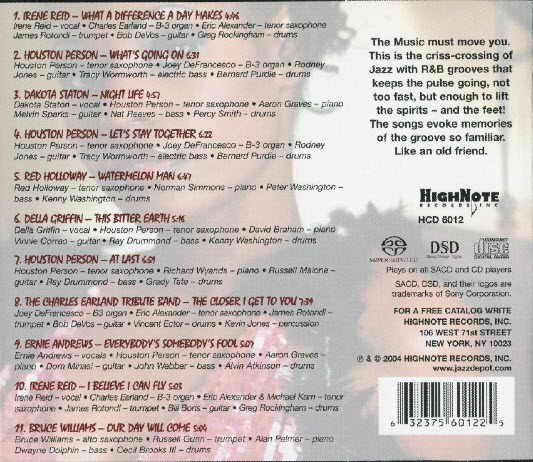 : 01. Iren Reid – What a difference a day makes 4:46 02. Houston Person – what’s going on 6:31 03. Dakota station – Night life 4:57 04. Houston Person – Let’s stay together 6:22 05. Red Holloway – Watermelon man 6:47 06. Della Griffin – This bitter earth 5:16 07. Houston Person – At last 6:59 08. The Charles Earland tribute band- The closer i get to you 7:34 09. Ernie Andrews – Everybody’s somebody’s fool 5:07 10. Irene Reid – I believe i can fly 5:03 11. Bruce Williams – Our day will come 5:04