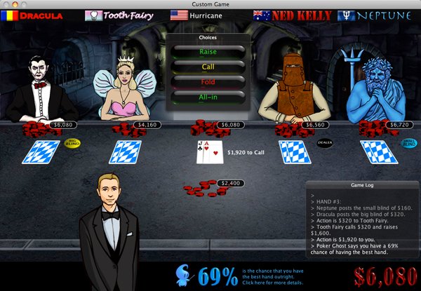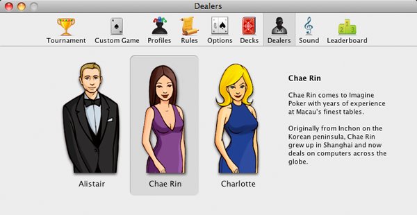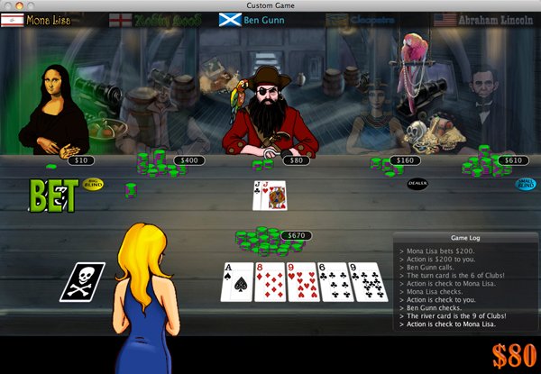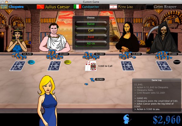 Play Texas Hold 'Em Poker on your Mac against 21 beautiful, unique, and talking characters that include Cleopatra, Julius Caesar, Napoleon, Genghis Khan, Dracula, the Mona Lisa, Abraham Lincoln, Sherlock Holmes, the Tooth Fairy, Robin Hood, Blackbeard, Merlin, and 9 others! Even the Abominable Snowman traveled all the way from Kathmandu to participate in the Imagine Poker tournament!