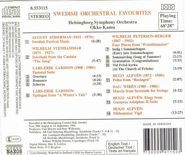 一份相当实用的瑞典名曲合辑,赫尔辛堡交响乐团与卡穆的合作相当优美,应该对大部分人都有吸引力,不应只局限于瑞典。整份演出非常的活泼,尤其阿尔芬和拉森几首曲子的演出更是在当今录音版本的首选之列,不但录音品质极优,曲目搭配也合宜。