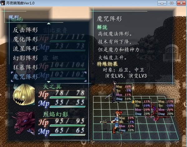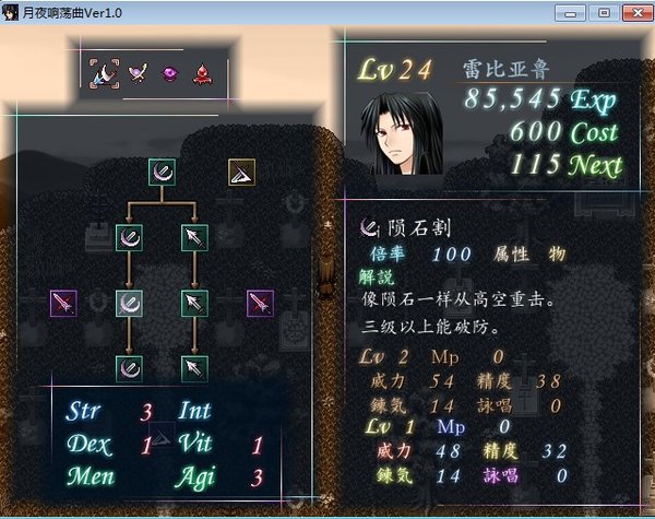 月夜に响下载虽然是RM作品,但制作非常精良,曾经获得日本RPG制作大赛的冠军。月夜に响人物的立绘以及点阵图都由专门画师绘制,尤其是点阵图的精细度上可以看出作者的用心。更值得一提的是游戏的战斗系统,采取半即时,连携行动,真实位移等系统。配合以RM游戏来说相当华丽的2D画面和战斗效果,让战斗模式变得十分爽快。   另外还有阵型系统以及技能树系统。