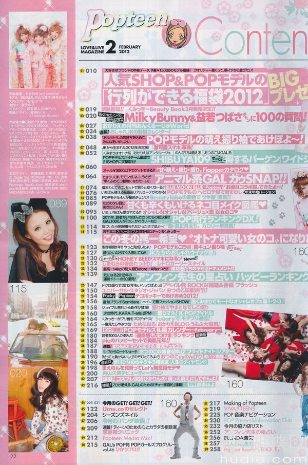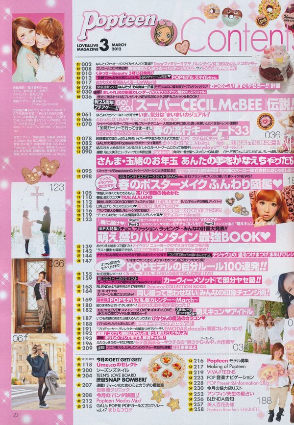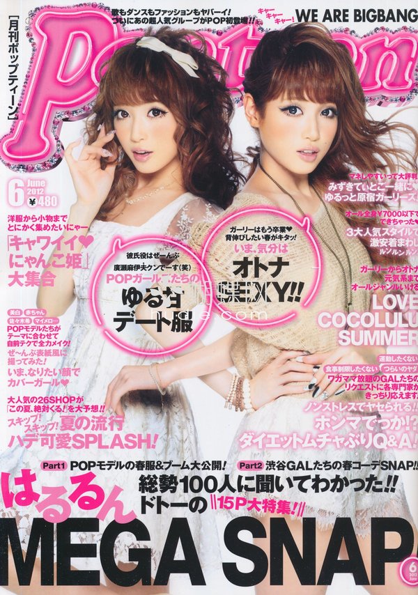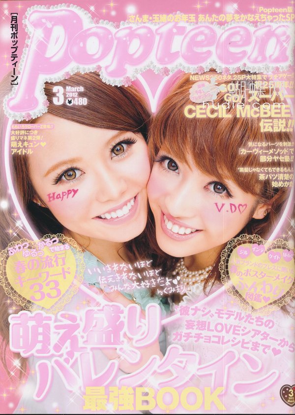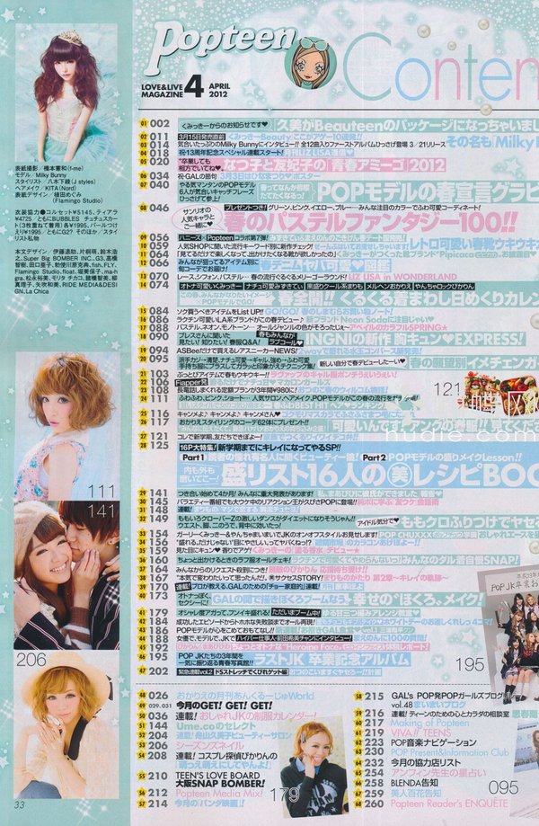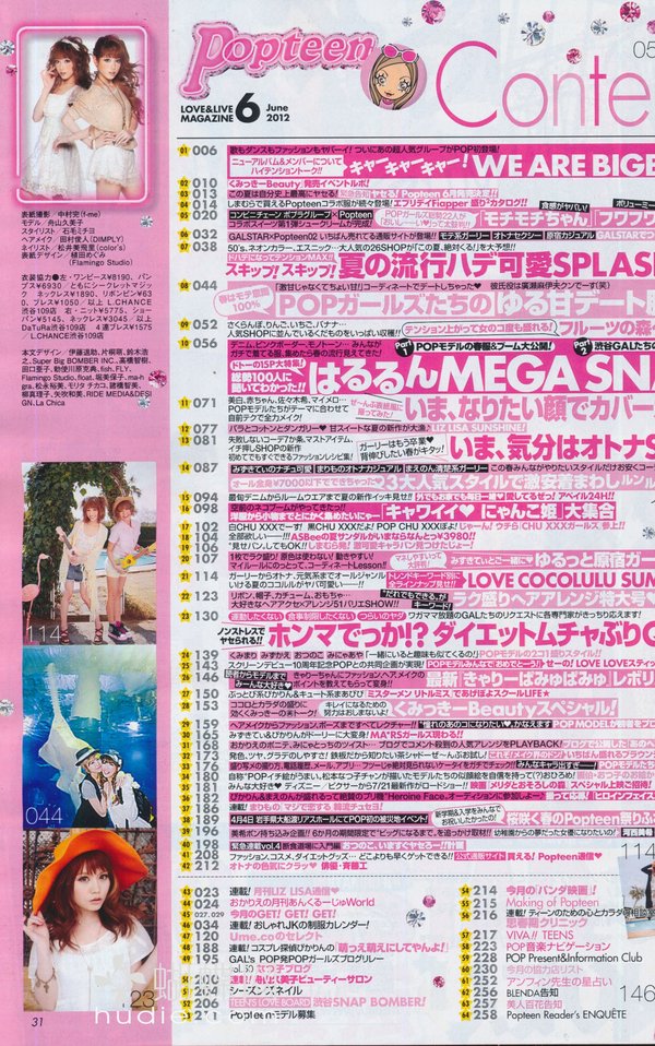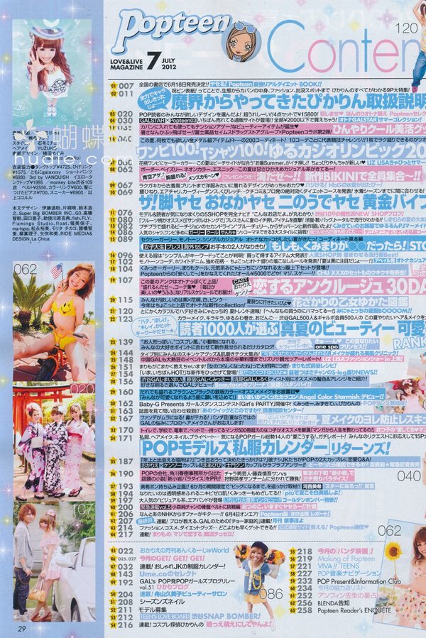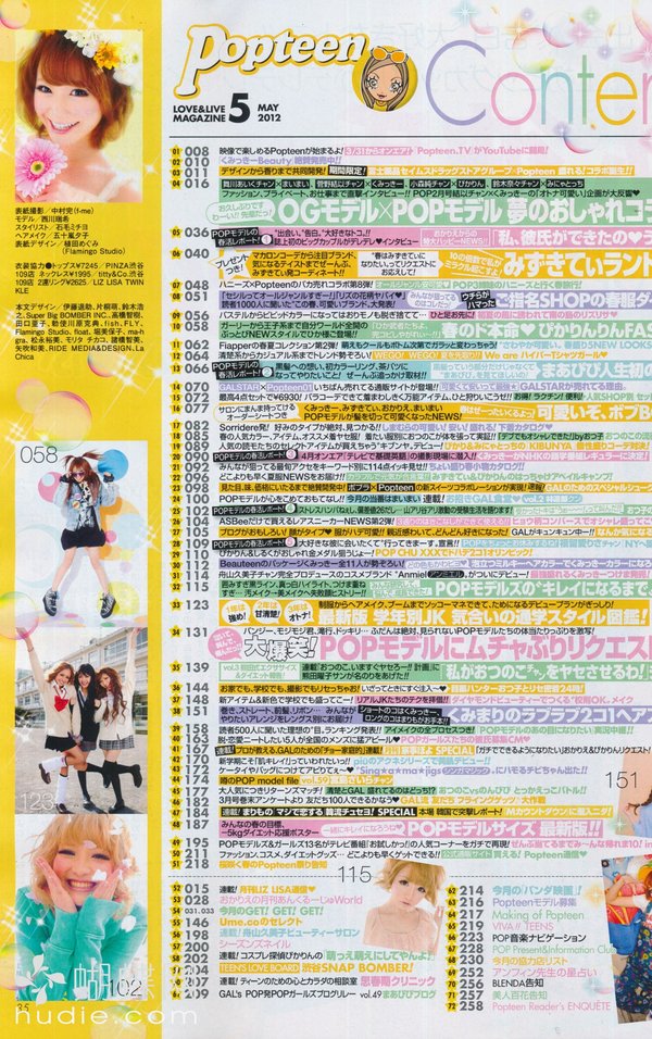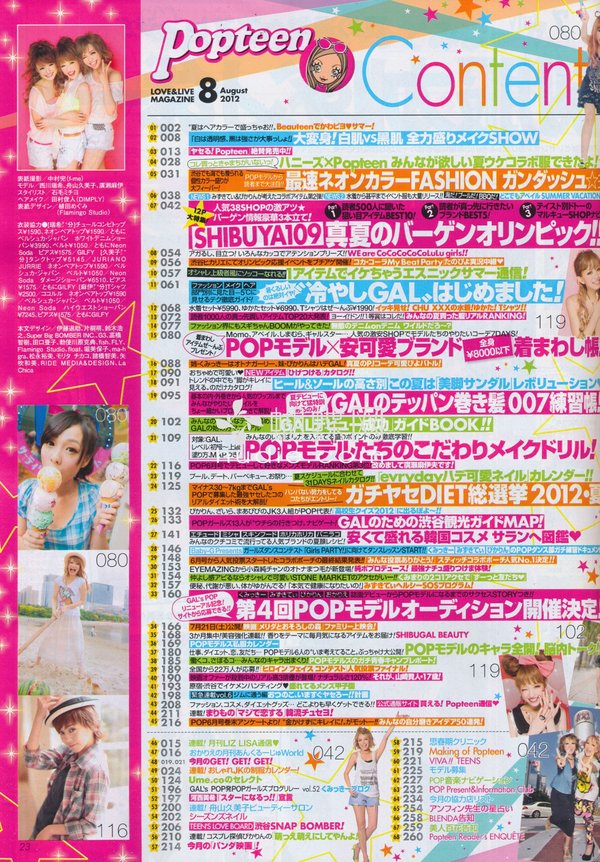 Popteen在东京是享受超高人气的时尚风向标。它收录日本时尚重镇——东京,涩谷,银座,名古屋——最新的流行资讯,最In的少女街头时尚装扮,最浓的时尚气息,最pop的流行节奏!带你一起感受日本街头少女的流行时尚。最大胆,最前卫,最个性是该杂志的特色。各式服饰引领亚洲的流行浪潮,自然深受时尚女孩的追捧。比起Vivi,Ray,Mina,Camcan 等时尚杂志,针对的年龄群较为年轻。