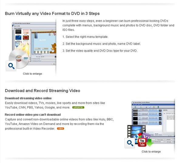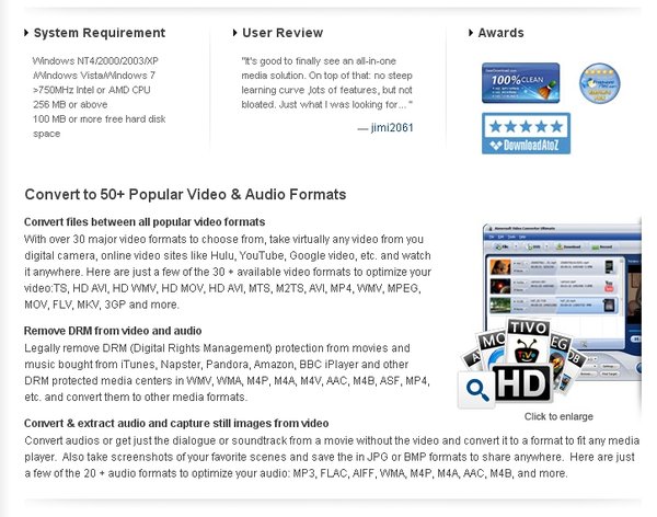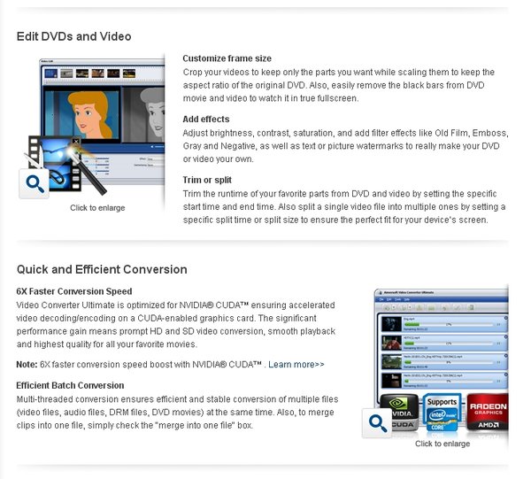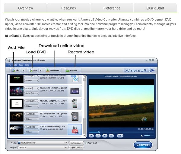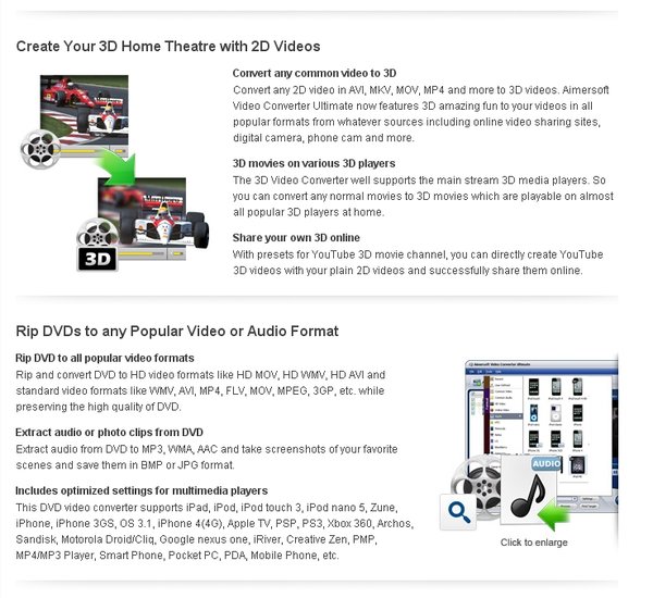 Aimersoft Video Converter Ultimate is a full-featured program that incorporates Video Converter, DVD Ripper, Video Editor, DRM Remover, Video Transfer, Online Video Downloader, and DVD Creator into one, offering an all-round solution to satisfy your multimedia demands. Whether you want to convert Video/DVD to the format you need, create your own unique videos, watch DVD movie on device like iPad, iPod, iPhone 3GS\ iPhone 44G, burn videos to DVD disc, etc.