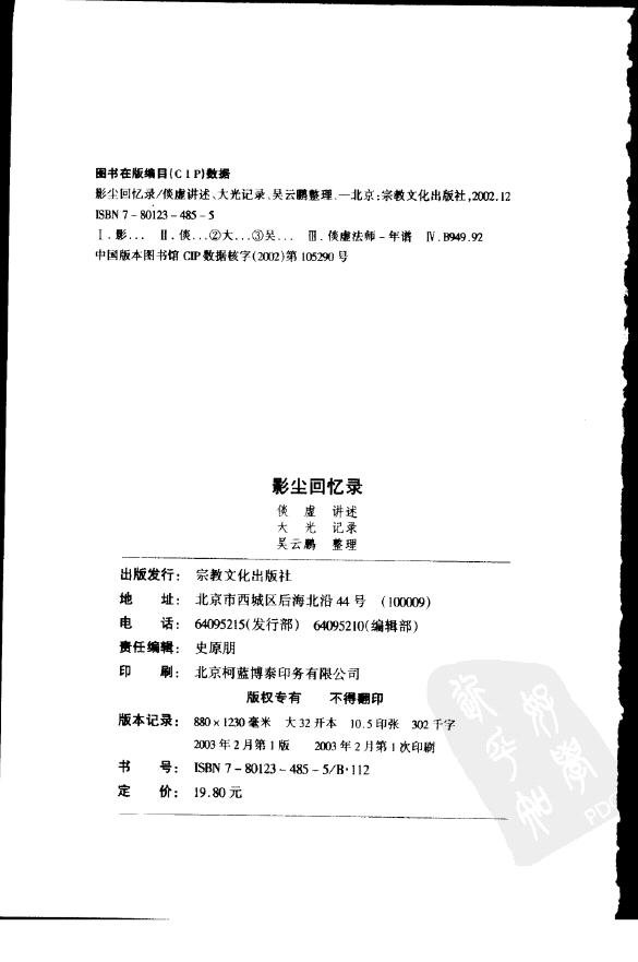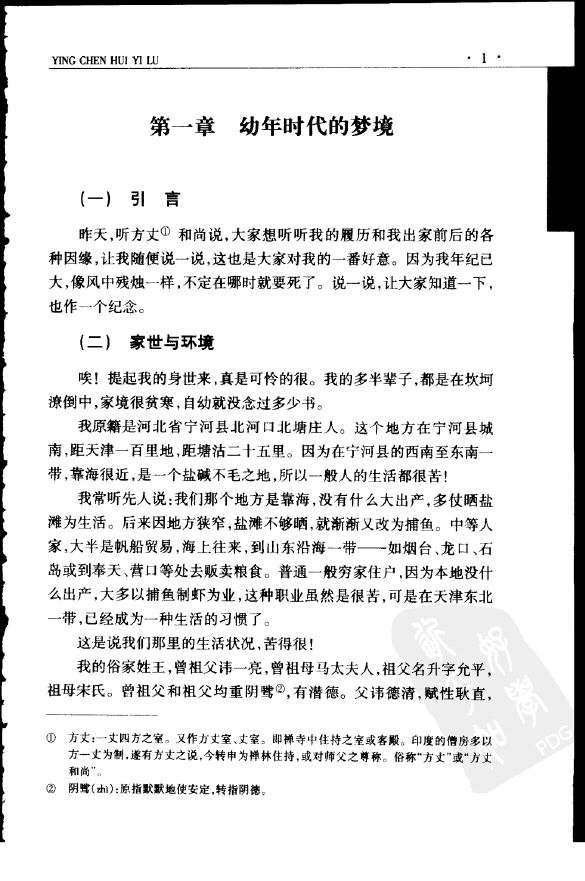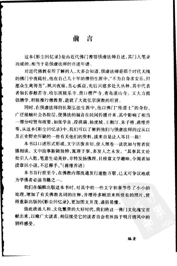 本书是由近代佛门耆宿倓虚法师自述,其门人笔录而成的,相当于是倓虚法师的自述年谱。从中可以了解到张学良、段褀瑞、杨虎城、王湘汀、朱子桥、蒋维乔等与倓虚法师的过从以及正史野史所缺的一些有关他的资料,读来自是让人耳目一新。