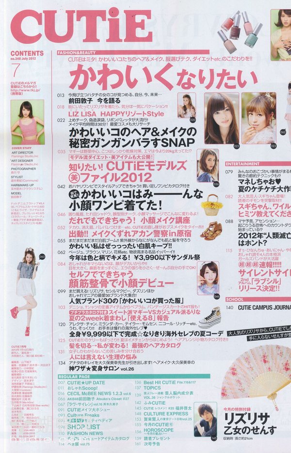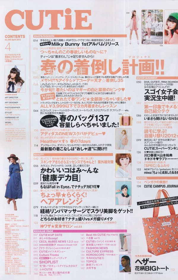 因为它包含了用色大胆、华丽可爱的街头混搭风格以及个性派的二手风格,从洋装到各式各样的配件与可爱的二手衣物,都被广泛的包含来做详尽的介绍。并请来当红的年轻偶像或是模特儿为你示范当月最流行的人气搭配穿着!此外,每一期的CUTiE语、学校都精心设计推荐情报的单元,补充年轻人最想知道的第一手讯息。例如,星座物科系与寻找工作梦想的困扰等丰富有趣的单元。