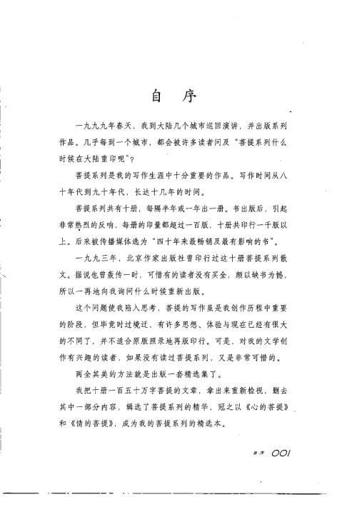 一九九九年春天,我到大陆几个城市巡回演讲,并出版系列作品。几乎每到一个城市,都会被许多读者问及“菩提系列什么时候在大陆重印呢”?