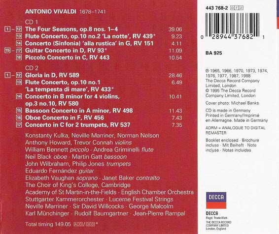by Andrea Griminelli (flute), Andrew Davis (harpsichord), Anthony Howard (violin), Eduardo Fernandez (guitar), Elizabeth Vaughan (soprano), Igor Kipnis (harpsichord), Janet Baker (contralto), John Langdon (organ), John Wilbraham (trumpet)