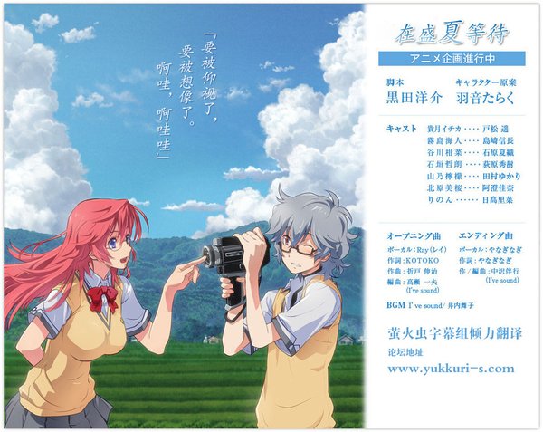 根据最新一号的月刊杂志「Megami Magazine10月号」封面及内容披露,由富有个人特色的黑田洋介小说家,以及知名的插画师羽音田乐老师,将齐齐联手创作出一部原创的TV动画,这部TV动画将定名为「在盛夏等待」,据内容介绍,这部作品是一部絶对的青春恋爱剧,再配上「盛夏」这一名字,相信大家已经体会得到「在盛夏等待」是一部在高温的夏天里,青年们大谈恋爱,把青春元素推至高位的作品。 天空湛蓝,万里无云。    积雨云翻涌,仿佛要将彼岸的山隐藏。    这是我们小镇上常见的风景。    但是,也是无可替代的“盛夏”。    那个男孩有一个模糊的想法“一无所有却想做点什么”,    所以和同伴商量一起拍电影。    就在那时,一个“特别”的女孩来到了这个小镇,    然后将男孩的想法视为“特别”。    男孩的名字是——雾岛海人。    女孩的名字是——贵月一夏。    他们的盛夏开始了。    我们在那个盛夏等待——
