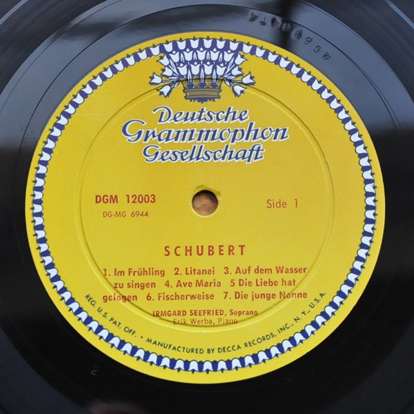 这张编号为 DGM 12000 的单声道唱片是DGG 33转最早系列片的第一张唱片。 从那张唱片人们可以看到标签上连右侧的倒三角形单声道标志都还没有形成,左侧也没有任何带有小圆角略长方形的”D.P.“等字样。 编号DGM 12000下方另有录音编号DG-MG 6940 (第二面为6941),在标签外黑胶上的钢模也同样刻有此号码“MG 6940 T4”,在另一端又有个“2”字。 而在本人收有的该唱片立体声再版DGS 712000 上,除了加上有别于之后形式的“STEREO”字样外,唱片编号下的数码改成了7-6940和7-6941,钢模印记是“7 6940 4”和“7 6941 4”。 以下是首版单声道黑胶 DGM 12000 的唱片标签: