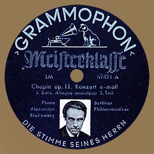 埃米尔在一九〇〇年获得国际版权专利的 “主人之声 His Master's Voice” 商标后,唱片标签改用留声机小狗作为标志。 那时是黑底金标(二三十年代)和深兰底银标(Meisterklasse,四十年代)的标签,如图: