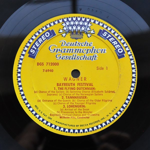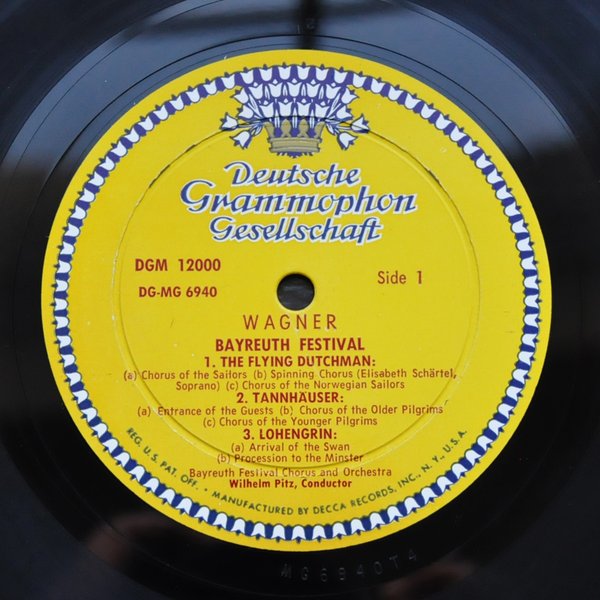 Side 1: From: THE FLYING DUTCHMAN 1) Chorus of the Sailors 2) Spinning Chorus 3) Chorus of Norwegian Sailors From: TANNHAUSER 4) Chorus OF nOOBLEMEN AND WOMEN (Entrance of the Guests) 5) Chorus of Older Pilgrims 6) Pilgrims 7) Chorus of Younger Pilgrims From: LOHENGRIN 8) Chorus OF Men (Arrival of the Swan) 9) Chorus of Nobles and Soldiers (Procession to the Minster) Side 2: LOHENGRIN (continue) 1) Bridal Chorus (Sung by the Men and Women) From: DIE MEISTERSINGER VON NUERNBERG 2) Wach' auf Chorus 3) Final Chorus From: GOTTERDAMMERUNG 4) The Horn has called From: PARSIFAL 5) Entrance of the Knights of the Grail 6) Youths' Voices