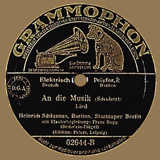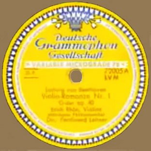 德意志留声机唱片公司(DGG) 创建初期唱片的标签Label 先是用天使为商标,那时的标签都是凹凸型直接刻在唱片上的,不是贴纸,就如早期的爱迪生发行的唱片一样,片子也极为厚重。 如图: