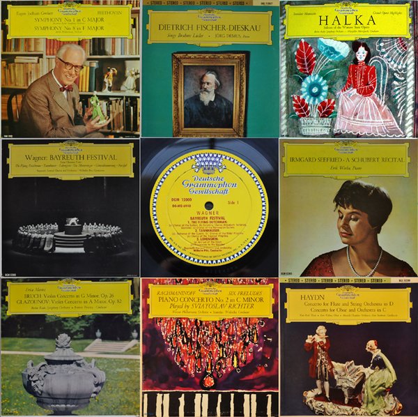 那个时期的唱片都是78转的。 德意志留声机唱片公司的(GRAMMOPHON) 在那些年代出的唱片中包括: Alois Melichar 的 Bach Brandenburg (编号15066/15073/27293/27307/27313), Karajan 的 Wagner Meistersinger / Berlin Stste opera Orch (编号67532), Caruso 的 Boheme with Scotti (编号78510A) 及其他一些唱片(编号85022A/85028A), Chaliapin 的 Mussorgsky Song (编号85024A), Kulenkampff 的 Dvorak and Schubert (编号95074), Furtwangler 的 Bach Brandenburg No.3 / Schubert Rosamunde / BPO (编号95417/95418), Furtwangler 的 Mozart Eine Kleine Nachtmusik / Cosi fan tutte overture / BPO ( Meisterklasse 编号67182/67184),等等。 三十年代德国经济大萧条时DGG也不得不在一九三七年宣告破产,幸由德国银行和特律风根Telefunken 接手方得以继续经营。纳粹掌权后,纳粹把德国所有的大企业都收归国有,一九四三年德国政府命令德意志留声机唱片公司停止使用在英美两敌国也都使用的留声机小狗商标。 因此在二战结束后作为投降条件之一,DG 也丧失了对小狗商标的所有权,并被西门子公司(Siemens & Halske electronics company) 收购,在一九四九年由西门子广告顾问 汉斯·多米茨拉夫Hans Domizlaff 设计,推出全新的郁金香皇冠标志,这就是大家所熟悉的黄标古典品牌。此外,DG 公司在一九四七年另推出 Archiv 附属品牌专攻巴洛克乃至中世纪早期音乐。 以下是五十年代初期带有郁金香皇冠标志的 DGG 78转唱片标签: