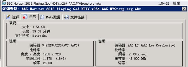 【编码参数】: 代码 Technical Specs Video Bitrate: 1631 kbps Video Resolution: 720 x 416 Video Aspect Ratio: 1.731 (16.9) Frames per Second: 25 Audio Codec: 0x0055 MPEG-1 Layer 3 Audio Bitrate: 128 kb/s CBR 48000 Hz Audio Streams: 2 Audio Languages: English RunTime per Part: 59mins Number of Parts: 1 Part Size: 746 MB Ripped by: Harry65 Source: PDTV Technical Spec for HD Video Codec: x264 CABAC Video Bitrate: CRF 18 (3103 Kbps) Video Aspect Ratio: 1.778:1 Video Resolution: 1280x720 Audio Codec: AAC-LC Audio Bitrate: 160 Kbps ABR 48KHz Audio Channels: 2 Run-Time: 59mins Framerate: 25FPS Number of Parts: 1 Part Size: 1.37 GB Source: HDTV Encoded by: JungleBoy