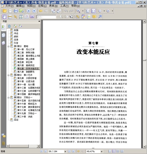 乔希·维茨金知道象棋的顶尖高手意味着什么。自从9岁那年摘得了他的第一个全国象棋锦标赛冠军头衔之后.他就成为一名公众人物。才十几岁就已经被各种媒体所包围。同时,维茨金的父亲创作的《壬者之旅》一书也被拍成很有名的电影。在引领校园象棋界十年之后,维茨金开始涉足武术太极拳。并最终赢得了国际锦标赛的冠军。为什么维茨金能够在这两个看起来截然不同的领域都取得如此卓越的成就呢?“我意识到自己最擅长的既不是象棋也不是太极。”他说,“我最擅长的是学习的艺术。”