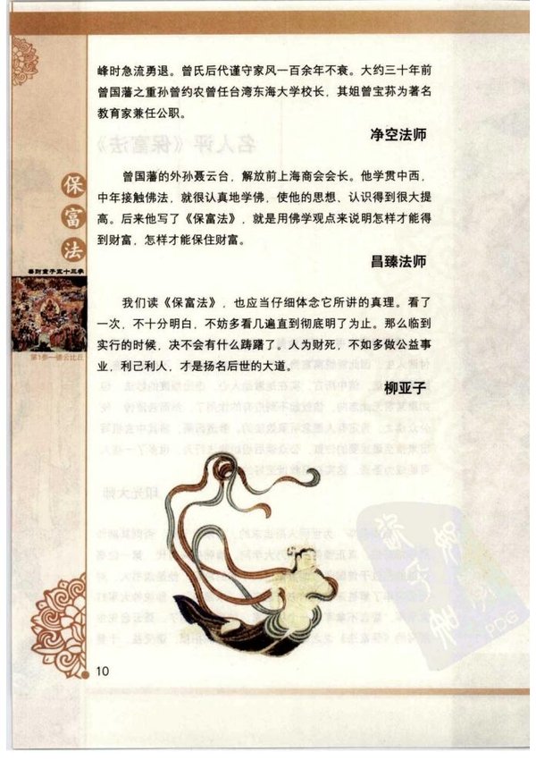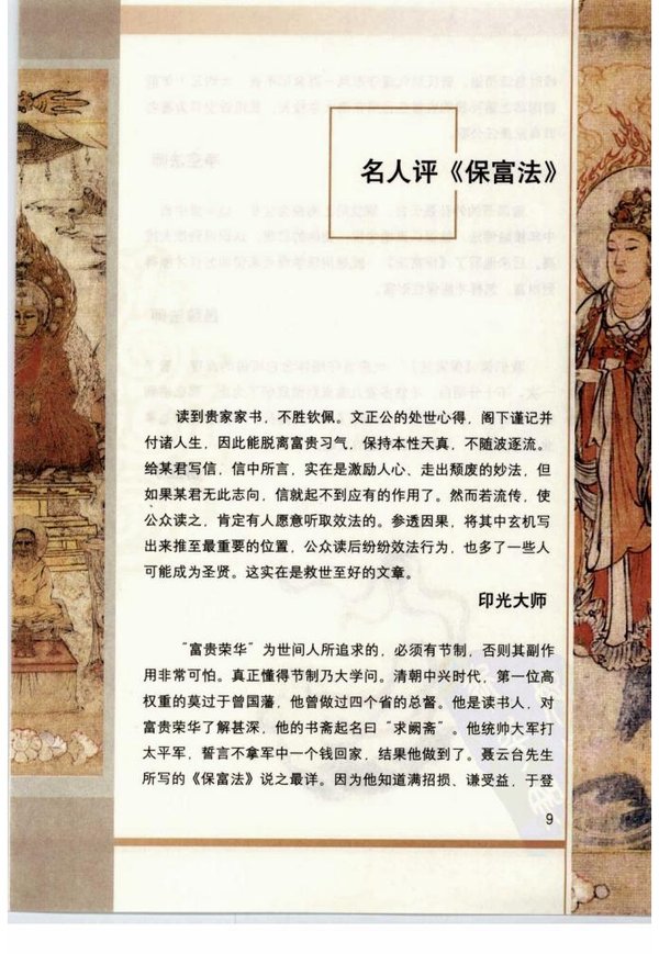 《保富法》就是用佛学观点来说明怎样才能得到财富,怎样才能保住财富。他谈的完全是以他个人一生接触,亲眼看见的。他接触了两类人物,其中一类是与曾国藩同时代的一批做大官的人。如李鸿章、左宗棠一类的人,他对这些家庭都很熟悉,他观察了这些家庭的兴衰成败。有些家庭第一世做大官、发大财,第二世家破人亡;有些家庭子孙很好,能够继承家业,若干代下去都还出人才,保有财富,保有社会地位。他就是抒发这种观点,来看种什么因,结什么果。如果你要希望子孙代代都有钱,那需要懂得种布施的因。布施是培福,布施是开源。又要懂得惜福,爱惜福报,不浪费,不奢侈,那么自然家道昌盛,就能够传若干代。