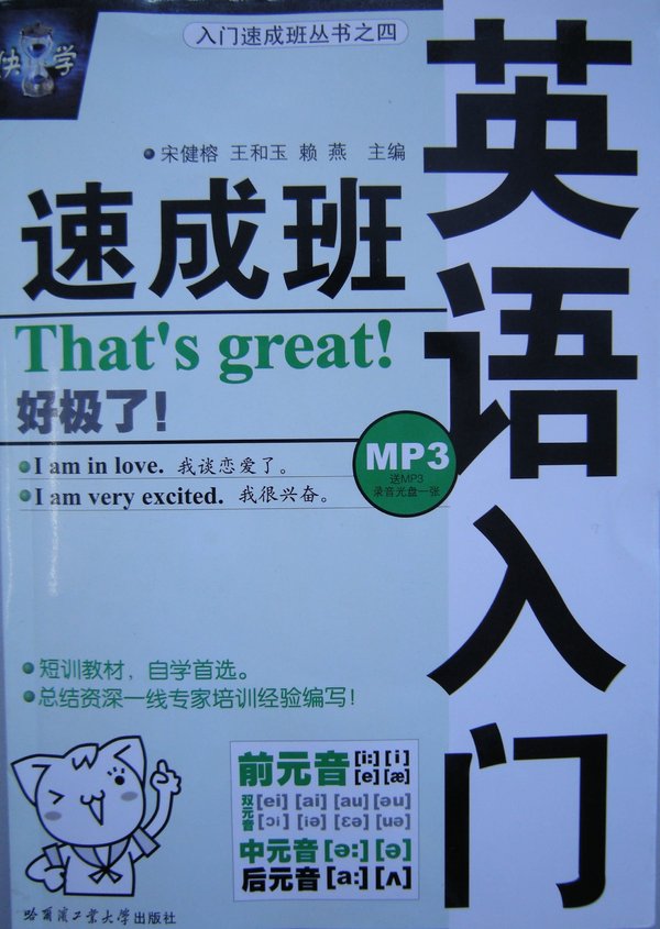 《英语入门 速成班 》 哈尔滨工业大学出版 作者: 宋健榕 书号:ISBN 978-7-5603-2273-5 页数:216页 开本:1/32 本书从训练语音基本功、提高口语能力出发,精心设计,让学习者在攻克语音关的同时能自然地过渡到实际的语境中训练口语,为学习者提供了一个轻松攻克英语口语的良好平台。本书共分为两篇:第一篇是基础篇,语音;第二篇是提高篇,实用口语。 主要特色: 自然攻克国际音标:通过口型图清晰讲解音标发音部位、发音方法,通俗易懂;安排了一句话突破发音、单词训练、短句训练和绕口令训练等有趣而有效的内容,使音标学习变得轻松、自然;每课音标学习后面还安排了拼读辨音和听音辨音的巩固练习,以帮助学习者真正巩固。通过这样大量的发音、拼音、辨音等实践,不仅能让学习者轻松掌握国际音标,培养正确发音、拼读的能力,而且还能自然而然地掌握许多常用词汇和表达法。 轻松掌握语音语调:语音语调的掌握是语言流畅、悦耳、充满活力的保障。本书介绍了英语语音的一些基本知识,如强读、弱读、连读、同化、不完全爆破音、升调、降调等,讲解简明易懂。每个知识点后安排了实战演练内容,做到即学即练,轻松掌握;课后还有适量的朗读练习和检测练习,以加强巩固。 真实语境训练口语:以现代生活用语为主,选择了浅显易懂的经典佳句,鲜活有趣,富有生命力;选择了现代生活中的流行对话,对话融入生活环境,饶有情趣,为学习者提供了真实的语境;在一些话题中还安排了文化视窗,让学习者在学习语言的同时,自然地体验和掌握一些英美文化,从而促进英语的学习。 但愿本书能帮助广大读者领悟英语口语的奥秘,提高自己的英语水准。 基础篇 语音  英语字母及音标常识  第一课 前元音   爆破音  第二课 后元音   摩擦音  第三课 后元音   摩擦音  第四课 中元音   破擦音  第五课 合口双元音   鼻音  第六课 集中双元音   半元音   舌侧音  第七课 英语语音基本知识   巩固练习答案 提高篇 实用口语  第一课 问候  第二课 介绍、认识  第三课 帮助、感谢  第四课 道歉  第五课 祝愿、祝贺  第六课 称赞  第七课 谈论天气  第八课 谈论兴趣爱好  第九课 打电话、上网  第十课 约会  第十一课 餐馆就餐  第十二课 购物 附录  数字  时间、星期、季节和月份  颜色  货币  公示语  谚语 最后,本资源为一张MP3听力光盘,请支持正版!请求加精~