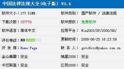 [资源名称] 中国法律法规大全.v3.5(免费版) [更新日期] 2008-6-12 [资源类型] RAR [资源语言] 中文 中国法律法规大全(电子版)是至今为止收集法规最全面、操作最简单的法律法规数据库软件。分类详细科学,独有几大功能:一、可将法规任意文本在WORD中直接编辑打印。二、独特的全文检索功能:可以一边全文检索一边浏览法规。三、收藏夹功能:可将您最关心的法规放在收藏夹中,以便随时调用。四、编辑功能;可将任意法规按您的分类方法进行编辑。更多功能不断完善中,尽请期待。 3.5版更新功能: 一、根据国务院部门变更,对原有法规分类进行了重新组织。 二、由于更新服务器变更,修改了数据更新代码。 三、增录了七千余条法律法规,目前收集数据达十二万余条。 四、修正了法规错误 http://www.duote.com/softImg/200806/25/1214382223.jpg