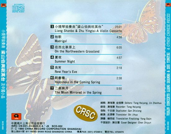 : 01. 小提琴协奏曲“梁山伯与祝英台” (何占豪、陈钢曲) 02. 牧歌 (沙汉昆曲 林华配器) 03. 在西北草原上 (焦杰曲 金复载配器) 04. 夏夜 (杨善乐曲 林华配器) 05. 良宵 (刘天华原曲 元之改编 黄贻钧配器) 06. 新春乐 (茅沅曲 金复载配器) 07. 二泉映月 (华彦钧原曲 何占豪、丁芷诺改编 陈燮阳配器)