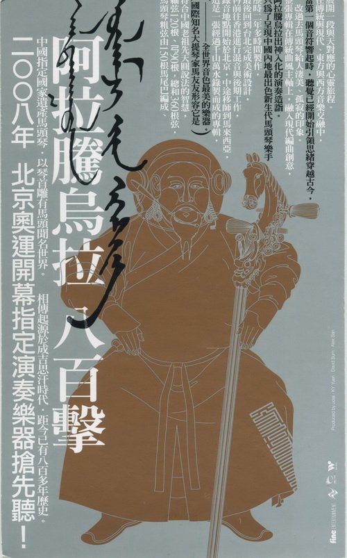 台湾首席唱片设计大师『萧青阳』继两次入围葛莱美奖「最佳唱片美术包装奖」后 以东方极简美学风格 让视觉感官为之一亮 本专辑藏有令人惊喜的包装设计! 透过手心的温度传递到包装纸上,原本的黑将转变为白色,文案的字就自然从中浮现囉! (详见商品附图) 2008年北京奥运开幕指定演奏乐器抢先听 【马头琴】中国指定国家遗产 相传起源於成吉思汗时代,距今已有八百多年历史 【马头琴介绍】: 在辽阔的蒙古草原上,马头琴不只是游牧时把玩的乐气,更是在庙堂之上神圣的乐音。传统马头琴粗弦由150根马尾巴编成、细弦120根、弓90 根,加起来正好是360,恰好符合中国老祖先天地运转太极学说的智慧,音色浑厚、悠长辽阔,彷彿是老天爷留在人世间的唯美声音。因此,当今世上绝对没有一项乐器,可以像马头琴这样栩栩如生,用声音表现出万马奔腾的惊人声势。 历经八百多年历史与文化的精髓,苦熬八百多个创作与革命的日子,集合八百多轨乐器与声音的硬碟,造就八百多次音符与音响的震撼,阿拉腾乌拉的个人首张马头琴演奏专辑《八百击》终於完成。这张专辑,比原先开始规划时所想的要困难许多,从曲目的挑选到编曲的方向,从古老悠远的旋律结构到现代科技的完美融合与呈现,每一次的挫折或挑战,都是对信心的一种打击。而今,浴火重生可说是对这张专辑最好的写照。这些年,从台北一路流浪到香港、北京、吉隆坡再回到台北,看到有太多为了理想而辛苦奋斗的音乐幕后工作者,默默为著本土音乐努力。当这些先民的歌谣、及被归类为民俗乐器演奏出来的传统音乐,能够历经千百年岁月,不曾划下休止符在时间里一代一代传承下来,肯定是中华文化的精华。愿华人音乐能走出亚洲,像西方古典音乐一样,登上世界舞台,引起共鸣,陶冶人心。