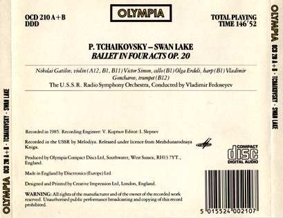 1985年由前苏联旋律唱片公司精心录制的这款柴氏《天鹅湖》在目前中国大陆已堪称绝版,这套双张CD于1995年的5月份在中图总公司音像中心卖出了最后一套以后,就再没有引进。由柴氏音乐最权威的诠释者弗拉基米尔•费多谢耶夫指挥前苏联广播交响乐团演绎的这版《天鹅湖》所使用的曲谱是柴氏完整版的,其于其他版本最明显的区别, 在于第三幕西班牙舞曲过后的一段小提琴华彩乐段的演绎是其他版本所没有的,由尼科莱•伽特洛夫担任独奏的这段华彩乐段完美地表现了俄罗斯小提琴学派精湛的技艺以及沉郁恢宏、大气痛快、酣畅淋漓的演奏风格…….。