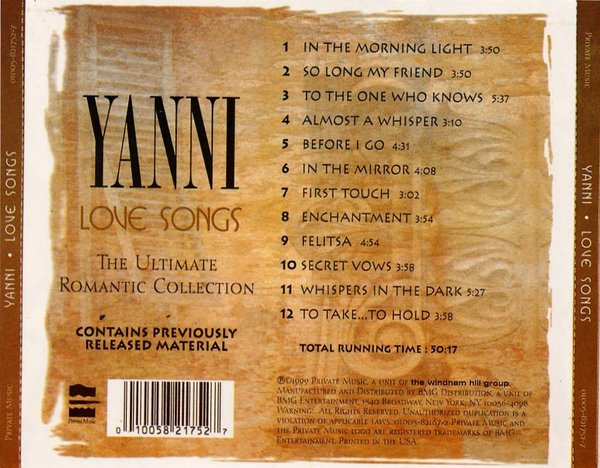 As Yanni compilations go (and this is his eighth, the fifth churned out by his former record company in a three-year period), this is a well-conceived package, commendable for its focus and continuity of style. It is, basically, music for bubble baths, a bouquet of warm, piano-based sweet nothings. Love Songs takes nine of its 12 gentle selections from two of Yanni's quieter releases, Dare to Dream and the hushed piano intimacy of In My Time, and its stately, neoclassical romanticism is more reminiscent of David Lanz than the ballad-like pop of Jim Brickman. For listeners in search of a non-jarring audio element to add to your evening of candlelight and massage oil, this is a worthy selection. If this strikes your fancy, seek out an overlooked 1984 solo piano gem from David Lanz, Nightfall. --Terry Wood