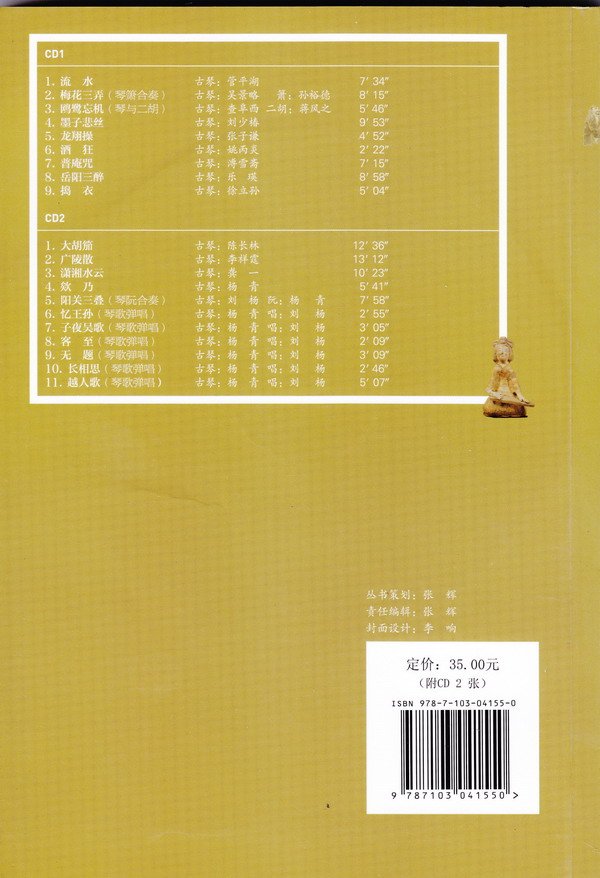 01. 大胡笳 古琴:陈长林 [0:12:36.19] 02. 广陵散 古琴:李祥霆 [0:13:12.34] 03. 潇湘水云 古琴:龚 一 [0:10:22.65] 04. 欸乃 古琴:杨 青 [0:05:40.69] 05. 阳关三迭 (琴阮合奏) 古琴:刘杨 阮:杨青 [0:07:57.58] 06. 忆王孙 (琴歌弹唱) 古琴:杨青 唱:刘杨 [0:02:54.67] 07. 子夜吴歌 (琴歌弹唱) 古琴:杨青 唱:刘杨 [0:03:04.43] 08. 客至 (琴歌弹唱) 古琴:杨青 唱:刘杨 [0:02:08.62] 09. 无题 (琴歌弹唱) 古琴:杨青 唱:刘杨 [0:03:09.01] 10. 长相思 (琴歌弹唱) 古琴:杨青 唱:刘杨 [0:02:46.16] 11. 越人歌 (琴歌弹唱) 琴:杨青 唱:刘杨 [0:05:06.49]