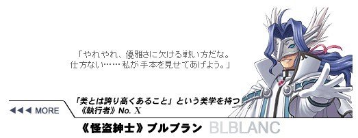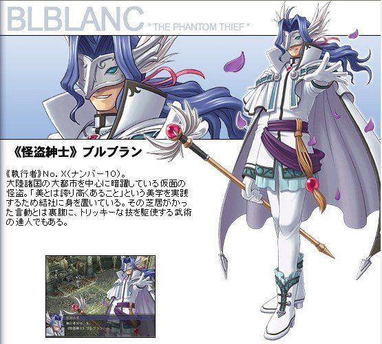 “执行者”No.X,在大陆上以“怪盗B”的名义登场,自称“美的探究者”,热爱美的事物,无时无刻不在钻研著万事万物的美。在《SC》的王立学园地下遗迹初次见面时,认定奥利维尔为美的对手,两人为这观点辩论了许久。他也很擅长变装,在《FC》的卢安市长官邸偷东西后被主角们追查,最后以变装(变装为仓库管理主任及市长管家)骗过艾丝蒂尔而逃跑成功。而其真实身份为“多情的欺诈师‘X’”。