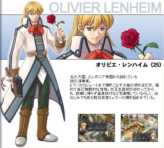 25岁。七耀历1177年4月1日生。来自位于利贝尔王国北方的埃雷波尼亚帝国之神秘男子。擅长使用导力枪与导力魔法攻击。《FC》时报称自己的职业为演奏家,在游戏里经常声称自己为“为了寻求爱而旅行”的诗人。精通各种各样的乐器(根据本人所言),平时在外最常使用鲁特琴(甚至战斗时的某些战技中也会出现),钢琴的演奏也被大部分其他主要登场角色甚至NPC称赞。个性非常轻浮且常常做出一堆常人无法理解的言行,屡次使周围的人无言以对。此外他也自称为美食家,曾经在柏斯喝了价值50万米拉的葡萄酒-“格兰·夏利拿”(柏斯市长准备赠送给女王的上等酒),却因付不出钱而被抓去监牢。