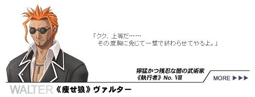 《FC》时由于意识被怀斯曼操纵,性情及举止变得凶暴,但他其实是个为人爽快的大叔。