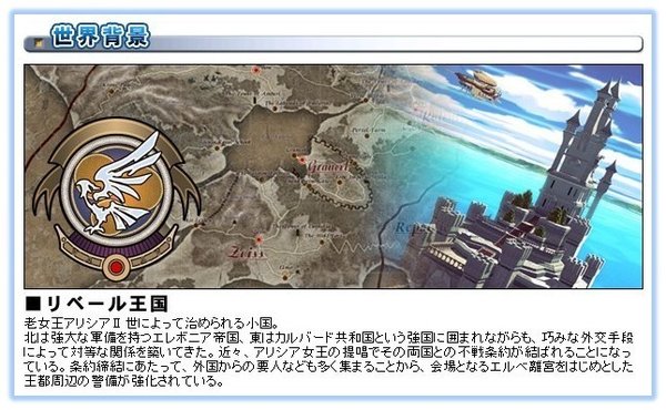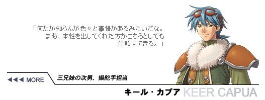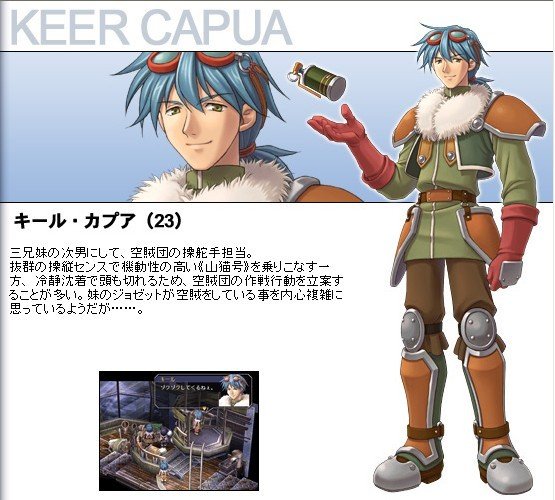 以前曾是埃雷波尼亚帝国北部的一个小领主,虽然曾经身为卡普亚男爵家的继承人,但是由于被奸商骗取了领地,被迫沦落到带着年幼的吉尔和乔丝特流浪到利贝尔的境地。唯一还有的只有飞行船“山猫号”及一些家臣而已。
