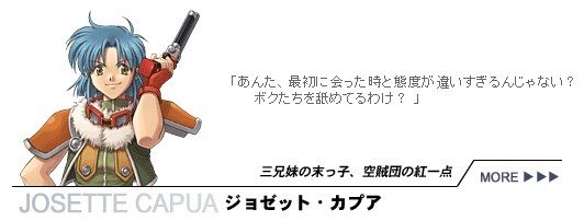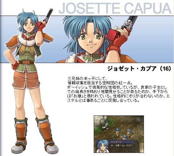 16岁。空贼团“卡普亚三兄妹”中排行最小的。在空贼团担任情报收集的角色,擅长使用导力枪。从外表看上去就像男孩子一样好胜,有着不轻易认输的性格。但有时候从其言行也能感受到其身为妙龄女子的一面。也因此团中的手下皆尊称其为“大小姐”。其性格和艾丝蒂尔属于同一类型,所以见面时往往会唱起对台戏,加上乔丝特也喜欢约修亚,因此战况又更加激烈。