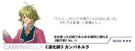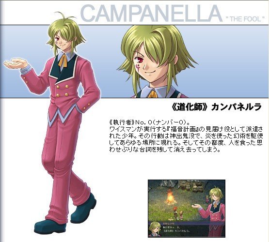 “执行者”No.0,擅长使用火焰的幻术,至目前为止仍未与主角群直接发生冲突。被盟主派遣为“福音计划”的监督。在怀斯曼死亡后取走“辉之环”并交给“盟主”。