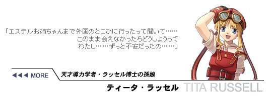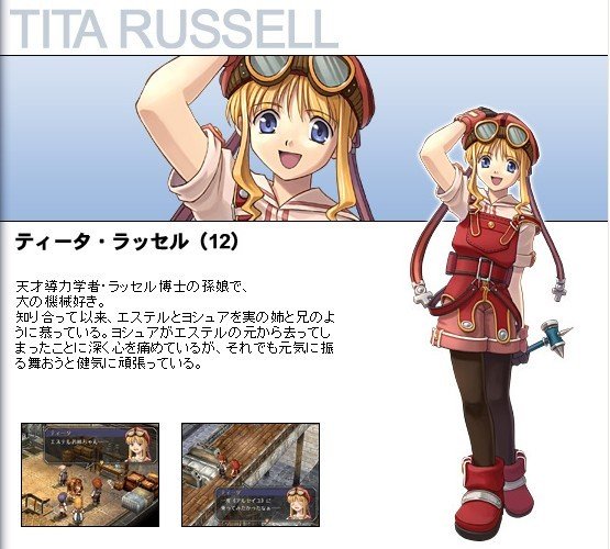 12岁。拉赛尔博士的孙女,从小生活在蔡斯市。外表柔弱,却拥有坚强的性格。那超级可爱的样貌亦让她获得了不少登场角色的疼爱。提妲本身也是个导力技术人员,个性与拉赛尔博士非常相似,做实验常常做到非常投入的状态,周围的事物都看不见了。由于是独生女且父母长期不在国内,所以将艾丝蒂尔、约修亚视为自己的姐姐和哥哥。与阿加特也非常要好,甚至好到令她的父母十分担心(尤其是母亲)。擅长的武器是导力炮,可以进行远距离的范围式攻击。