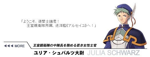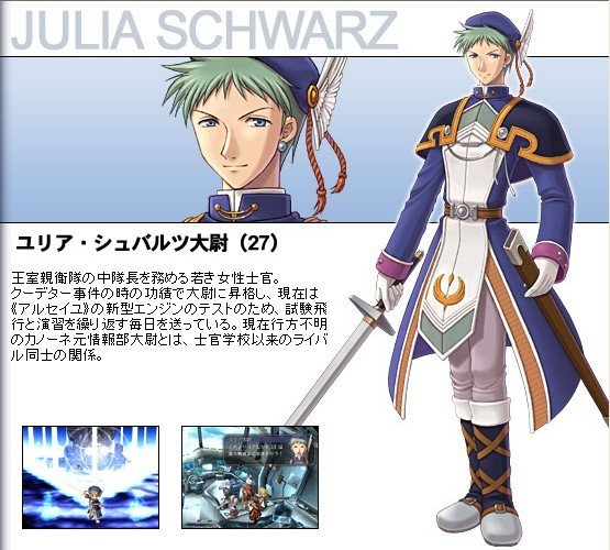 27岁。现任王室亲卫队的女中队长,卡西乌斯弟子之一,为埃尔赛尤号的舰长,在剑术上拥有不错的实力。与凯诺娜上尉在军校时就是劲敌,有“文有凯诺娜,武有尤莉亚”的说法。《SC》时升格为上尉。