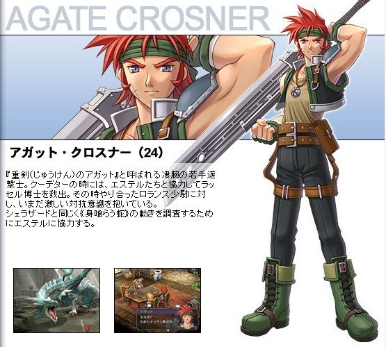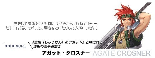 24岁。被称为“重剑”的游击士(C级。《SC》时升格为B级),来自柏斯地区的拉文努村。其战斗风格为挥舞巨大的重剑直接攻击敌人,较不擅长导力魔法(《SC》第一章时阿加特说的话的意思)。无论在《FC》、《SC》还是《the 3rd》,阿加特均拥有全主角群中最高的STR值。阿加特对游击士这份工作比别人更加倍有责任感及自尊心,亦不擅言令,所以常常令新手游击士像艾丝蒂尔们觉得其难以亲近。他在成为游击士以前,曾为卢安市小混混组织“渡鸦帮”的头目。有一个妹妹,在10年前的百日战役内意外身亡,因此讨厌军人这种职业。