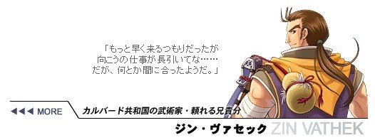 30岁。被称为“不动”的A级正游击士,来自卡尔瓦德共和国。长得很高大因此常被误认为熊。性格敦厚豪迈,富有应变能力,是个可以依赖的大哥型人物。为“泰斗流”的武术家,以自己的拳头当作武器。他拥有主角群中最高的DEF及最高HP值。发动“龙神功”之后的金,攻击力和防御力提高非常多。