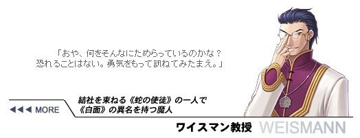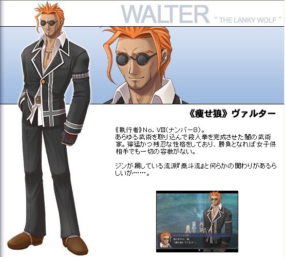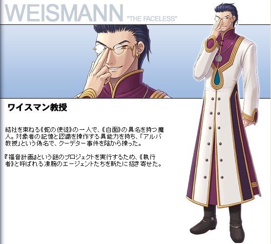 37岁。“蛇之使徒”第三柱。“福音计划”的负责人,结社的同伴习惯以“教授”称呼他。是《FC》政变事件及《SC》所有事件的主谋,《FC》时化名“亚鲁瓦(Aruba)教授”以考古之名在利贝尔各地活动。在《SC》最后夺取“辉之环”后,逃走时被凯文暗杀。怀斯曼拥有操纵对象的记忆和认知方面的特殊能力。以前曾加入七耀教会,对圣痕能够使人成为超人非常感兴趣;后被教会判定为“异端”。