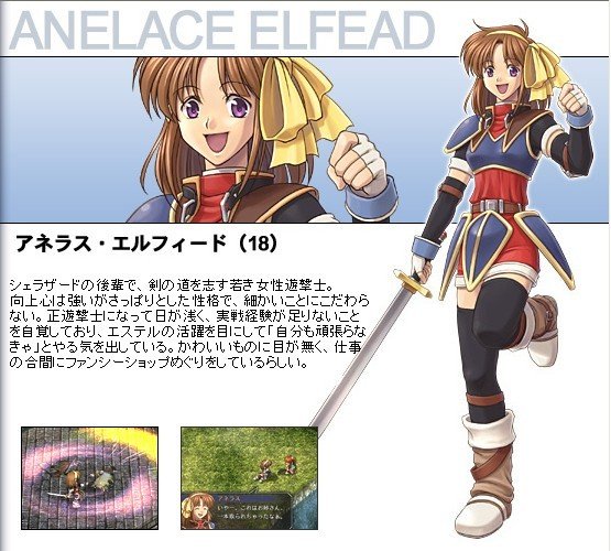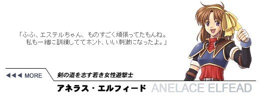 16岁。七耀历1186年8月7日生。《FC》、《SC》的女主角,从小生活在洛连特。故事一开始时为准游击士。有着天真烂漫的性格,非常开朗有精神的少女,所有与她接触过的人都对她的个性有着深刻的印象,只要有她的存在,周遭的气氛都会被她改变。平时似乎有点少一根筋,但有时会显现出过人的直觉及洞察力。喜欢斯托雷加企业制作的运动鞋和钓鱼竿。口头禅是“あんですって〜! ”与“〜ですけど”。在《FC》的最后成为正游击士,《SC》后期成为A级正游击士(视乎玩家表现)。