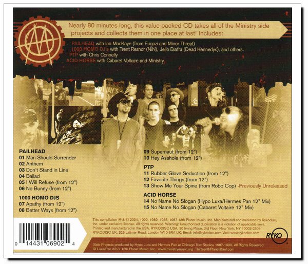 Both Rykodisc and Al Jourgensen deserve accolades for finally compiling this material together onto one disc, and I must say I was greatly looking forward to hearing such classics as "No Name, No Slogan" and "Rubber Glove Seduction" in sparkling remastered glory. I have the other Ministry reissue disc and the RevCo releases as well, and while their quality varies considerably, all of them sound distinctively improved. Unfortunately, the reality with this compilation is that something must have gone horrible awry in the mastering -- perhaps somebody grabbed the wrong files -- for these tracks sound worse than the WaxTrax! originals by a long shot. In most cases, intricate details and stereo effects that panned back and forth are completely gone, and worst of all, the tracks sound flattened and lifeless. Instead of demonstrating the heart-pumping, fist-pounding, immaculately-produced anthems these tracks once were, Side Trax offers a bunch of monochromatic, monophonic replications that give the whole project an overwhelming feeling of "cash cow" with little attention paid to quality control. I have yet to figure out how I am the only one on earth who has yet noticed this flaw, but I may as well offer this up to those with discerning ears who were looking forward to hearing their old time WaxTrax! favorites in a new light. This, sadly, is not your opportunity. EDITED TO ADD: As of March 2005, Rykodisc have corrected the error and re-pressed the CD with the proper stereo mastering. You can contact them and have your problematic copy replaced with very little hassle. The new mastering sounds good, if not necessarily better than the original EPs -- a testament to how ahead of their time they once were.