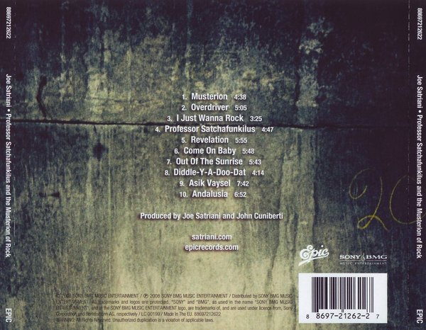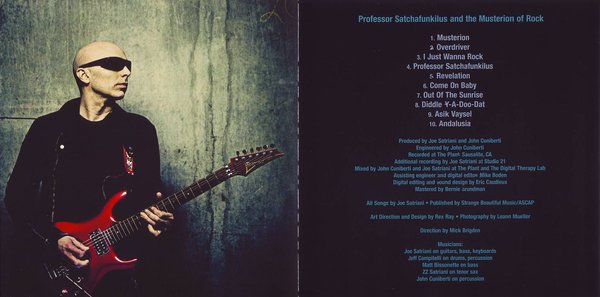 ◎闯荡乐团刚满30年岁月之际问市全新录音室作品《Professor Satchafunkilus and the Musterion of Rock》,由Joe以及老搭档John Cuniberti(Tracy Chapman、Kevin Kern、Aaron Naville)联手制作。首发单曲《I Just Wanna Rock》,直接导向摇滚乐最撼动人心的情感,无须长篇歌词的伴唱,利用吉他语言的传达,和乐迷做出互动对话,再展卓越悍人之演绎技巧;虽是首偏中慢版曲子的《Overdriver》,不时飆出的速弹气流,再次令人惊艳不已;《Professor Satchafunkilus》则参杂轻松愉悦的快乐感受;抒情推荐《Come On Baby》与钢琴伴随的《Out of the Sunrise》,都是勾起聆听着内心感动的小品集;揉合拉丁情怀的末曲<Andalusia>,飘散浓厚佛朗明哥的异国韵味。