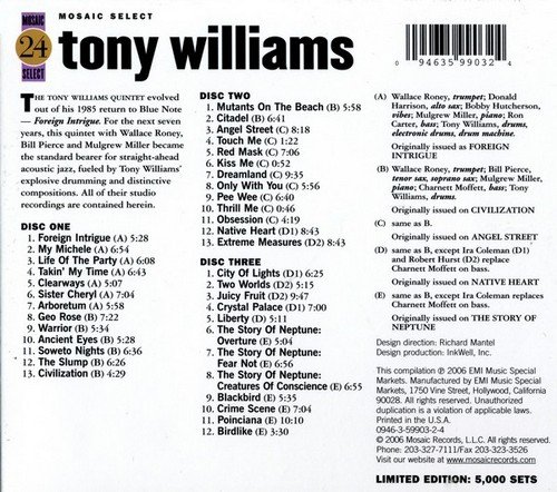 Этот замечательный 3CD бокссет от Mosaic Records посвещенный памяти прославленного ударника джазтруда Antony Tillmon "Tony" Williams как-то после новогодних праздников и принес ослик из сети! Содержит студийные альбомы Tony Williams Quintet изданные Blue Note в 1985-91 годах - Foreign Intrigue '85 , Civilization '86, Angel Street '88, Native Heart '89, The Story of Neptune '91.