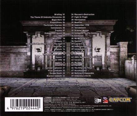 : 1) Briefing 1:43 2) The Theme of Umbrella Chronices 1:59 3) Begin Here 2:16 4) Preparations 2:13 5) The Ecliptic Express 2:01 6) Convulsions 1:10 7) Trauma 0:36 8) Endogenous Opioid 0:58 9) July 1998 1:44 10) White Out 2:06 11) Mimesis 0:58 12) The Zombie Who Came In From The Cold 1:03 13) Outbreak 1:52 14) Salute 1:02 15) Endtroduction 0:48 16) The Mansion Incident 0:45 17) Swoon 1:16 18) July 24 1998 1:50 19) Exposure 1:20 20) Initial R 1:42 21) Suicidal Explosion 1:39 22) Virus Syndicate 2:30 23) Escape Death 0:51 24) Blacken Sabbath 1:39 25) Slight Injury 0:50 26) Racoon's Destruction 1:43 27) Fight or Flight 1:15 28) Sterilization 1:31 29) Beasties 1:51 30) September 1998 1:41 31) Tetrodotoxin 1:28 32) Oriental Woman 2:12 33) Sympathy For The Zombie 2:20 34) Extinction 0:39 35) No Word For It 1:43 36) Hazmat 0:41 37) Live Evil 2:25 38) Umbrella Rips 0:32 39) Unlikely Allies 1:42 40) To The End 1:08 41) Escapee 2:20 42) 2003, Somewhere Over Russia 0:49 43) Corporal 2:04 44) No Data 0:49 45) Palma 0:52 46) You Only Live Twice 2:06 47) Accumulation 1:03 48) Nothing Is Impossible 2:35 49) Umbrella Lives On 3:21