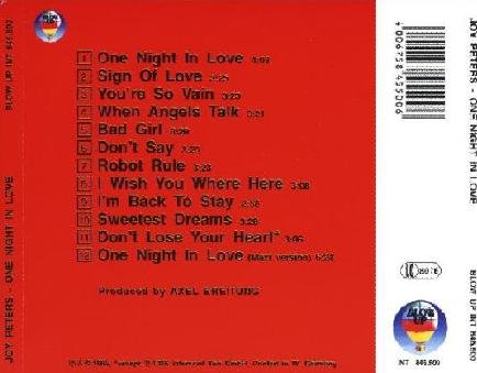 好了像我一样的老乐迷这下有福了,就是这位来自德国的小伙子(现在该叫大叔了)给我们带来了他的成名作《One Night In Love》。此专辑收录了许多你曾经听过但叫不出名字的歌曲,现在有机会能再次认识他是我的荣幸啊。在此要感谢无私奉献的德国驴友。 以下资料转自网络: 关于Joy Peters那个时代的音乐背景 从1983年开始舞曲音乐从意大利席卷全球。一些艺术家例如RYAN PARIS, GARY LOW, GAZEBO or MY MINE不仅在意大利大获成功,而且在西班牙,德国,法国等其它国家也成绩非凡。 当时在舞厅播放 I WANT YOU, DOLCE VITA (家庭舞王2收录)and I LIKE CHOPIN(我爱肖邦,MTV很好看),是简单但令人愉快的音乐,优美的男女声音和和声,你可以在2分钟后也能唱了。 1984年意大利成功的音乐公司增加。KEN LASZLO(荷东1今夜的演唱者)出品了HEY HEY GUY(这首被荷东专辑收录)等舞曲。这些舞曲也影响着德国和西班牙的迪斯科音乐。 德国的ZYX音乐公司首先意识到意大利舞曲潜在的商业价值。THE BEST OF ITALO DISCO 系列专辑产生。MIKO MISSION′s HOW OLD ARE YOU and SCOTCH′s DISCO BAND(这首大家也很熟悉吧)发表在这神话般的音乐类型里。 1985年成功的故事还在继续。MAX-HIM′s LADY FANTASY or MARTINELLI with CENERENTOLA ( CINDERELLA ,灰姑娘) 等。一些德国和西班牙有灵性的音乐家也模仿这类音乐类型。