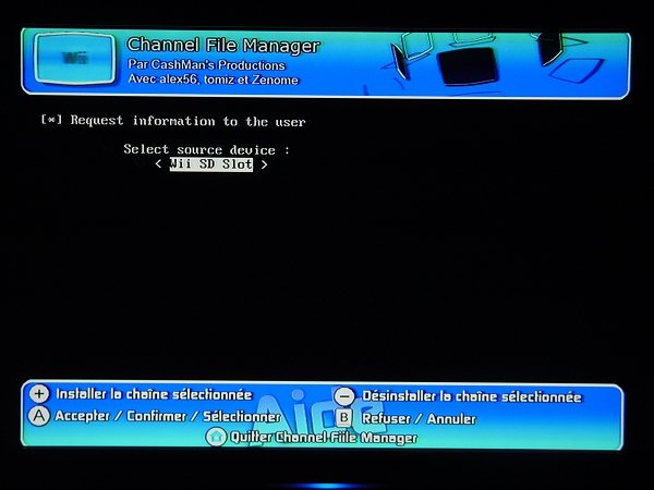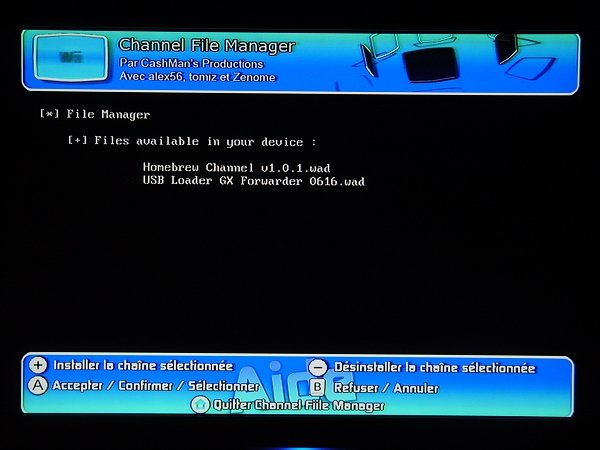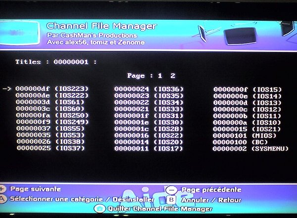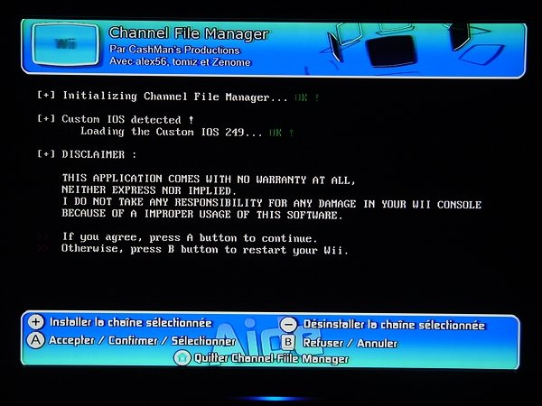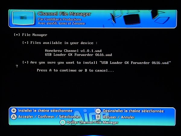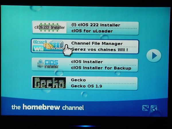重启后就可以看到多出来的HBC与UL频道了,至此,WAD安装盘已经没什么作用了,以后的安装都在HBC进行。 1-2、第二种HBC频道的安装方法(适合WAD安装盘无法安装的机友) 先将SD卡里的private文件夹改名(若存在),例如privateBAK,如果没有该文件夹,手动建立一个即可。然后下载工具列里的HBC1.03安装包,解压后将boot.elf以及private一起复制到SD卡根目录,把卡插回主机,开机后点击左下角的Wii标志,然后选择左边的数据管理,再选择右边的频道管理,进入频道管理后,点击右上角的SD卡频道,此时会弹出对话框询问是否安装HBC,选择是,主机会自动进入安装界面,静待数秒后,会提示你安手柄上的1键,按下后出现安装选择,点击Continue,将光标移动到Install The Homebrew Channel上按A键,再选择Yes安装。此后将boot.elf以及private删除掉,将一开始改名的private改回原名即可。 2、UL前端频道的安装(通过第1步里WAD安装盘自动安装的机友请跳到第3步) 进入安装好的HBC频道,如下图所示点击进入Channel File Manager(以下简称CFM)