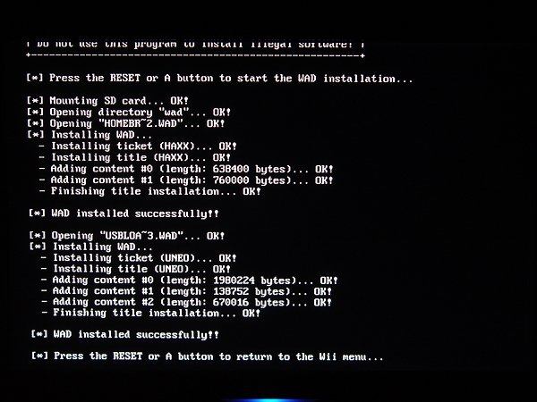 USB-Loader傻瓜式安装说明(以下简称UL): 此安装说明力求从简,从详的手把手教学,不讲原理,只讲过程,只为让更多的机友能用上这一可以说是伟大的功能。废话结束,开始。 首先请下载工具列里的SD教学包,再准备一张最好大于512M的已格式化为FAT或者FAT32的SD卡,并将教学包里的4个文件夹(apps、conifg、images、wad)与1个文件(IOS38-64-v3867.wad)全部复制到SD卡里,最后将SD卡插入主机面板上的SD槽,这样准备工作就完成了。 1-1、使用WAD安装盘自动安装the homebrew channel自制频道(以下简称HBC)与UL前端频道(已安装的机友请跳到第2步) HBC是一切的开始,要使用UL就必须先安装HBC。下载工具列里的WAD安装盘,解压后,将得到的ISO文件刻录为光盘,一定要用DVD光盘刻录,刻录软件推荐Imgburn,2X速度,(建议使用可擦写的DVD光盘,因为此盘基本就用这一次,以免浪费,而且万一刻出来不能用,也可重刻),放入主机,会识别为GameCube盘,点进入,就出现如下图中的界面,提示你按主机面板上的RESET开始进行安装,这里安装的实际就是SD卡WAD文件夹里的HBC频道与UL前端频道(前端频道仅相当于Windows桌面的快捷方式,并不是UL主程序本身)