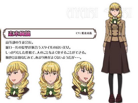 高中部的学生主席。是一个金色卷发,身材超好的美女。性格沉稳,能洞察人心。和鞠也青梅竹马,虽然,两人似乎并非亲密无间……