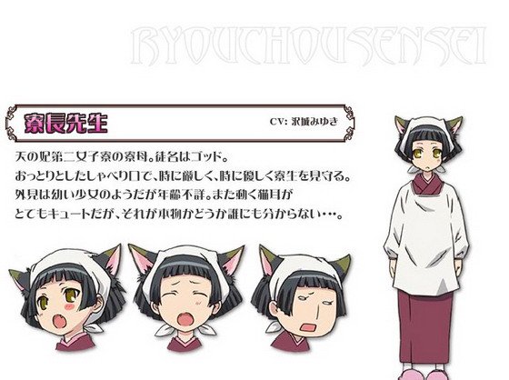 天妃第二女子宿舍的舍监。外号“主”。为人大方,对寄宿生慈严并举。外表娇小,宛如怀春少女,但年龄不详。一对猫耳活动自如十分可爱,但谁也不知道是真是假。