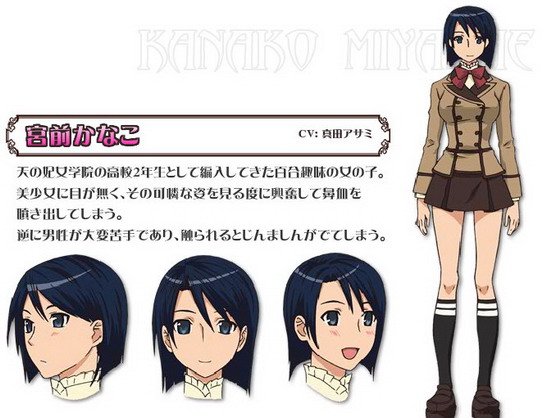 天妃女子学院的高中二年级女生,超喜欢百合。是个标准的花痴,一看到可爱的女孩子就兴奋得鼻孔喷血。反之,对男生不屑一顾。对男生的触碰保准起鸡皮疙瘩。