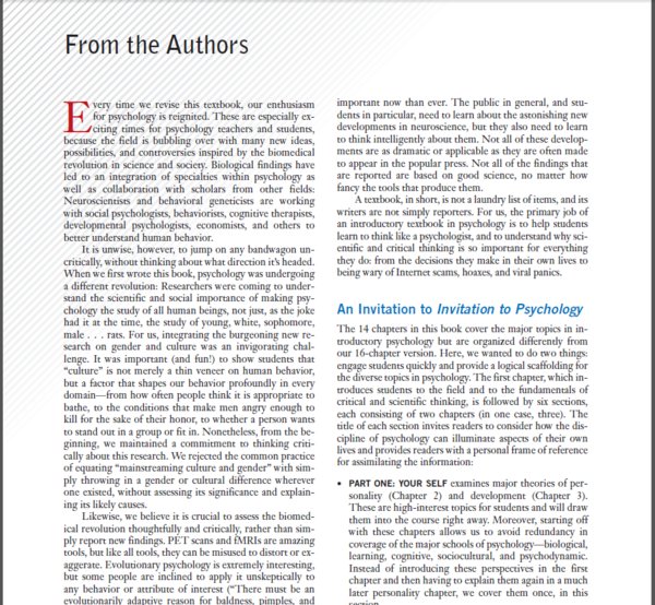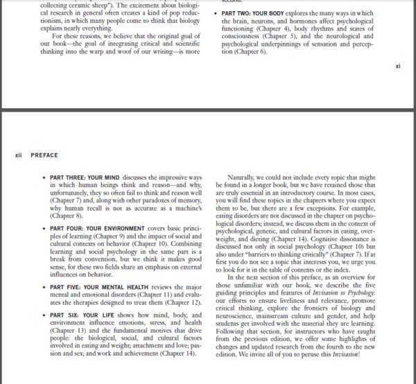 Wade/Tavris, Invitation to Psychology, 5/e uses lively writing and stimulating examples to invite students to actively explore the field of psychology and the fundamentals of critical and scientific thinking. Invitation to Psychology presents the science of psychology according to six areas of the student's experience: Your Self, Your Body, Your Mind, Your Environment, Your Mental Health, and Your Life. This unique organization engages students from the very beginning and gives them a framework for thinking about human behavior. Hallmark features of this best-selling introductory text include active learning features, an emphasis on critical thinking, a balance of classic and contemporary research, and thorough integration of culture and gender.